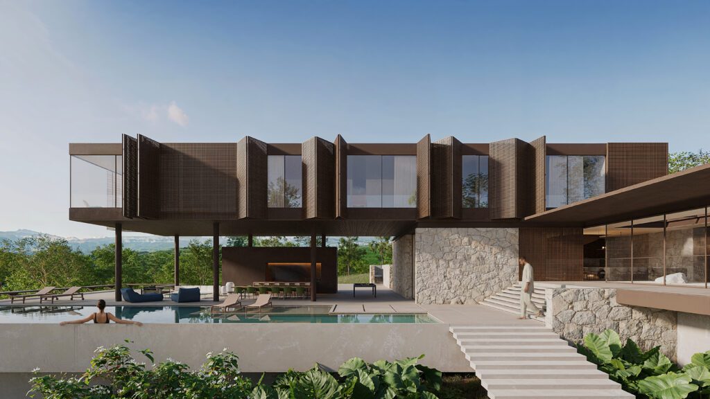 Between solids and voids, the structure unfolds in horizontal planes that connect with lightness. The house reveals itself in distinct ways depending on the point of view: from the main façade, it appears contained and quiet; from other angles, it exposes the complexity of its levels and the fluidity of its spaces. Pale stone walls contrast with metallic volumes, forming a sequence of layers that filter, protect, and unveil.
